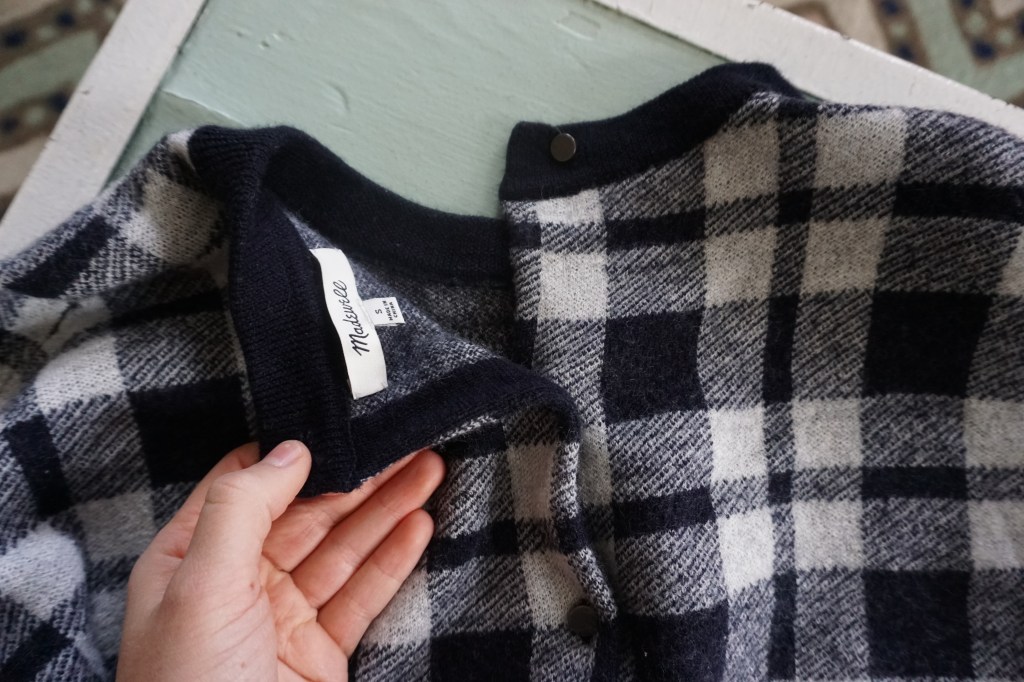 My sweater lost two buttons in the wash! I found the buttons, grabbed my sewing kit and fixed what was broken.